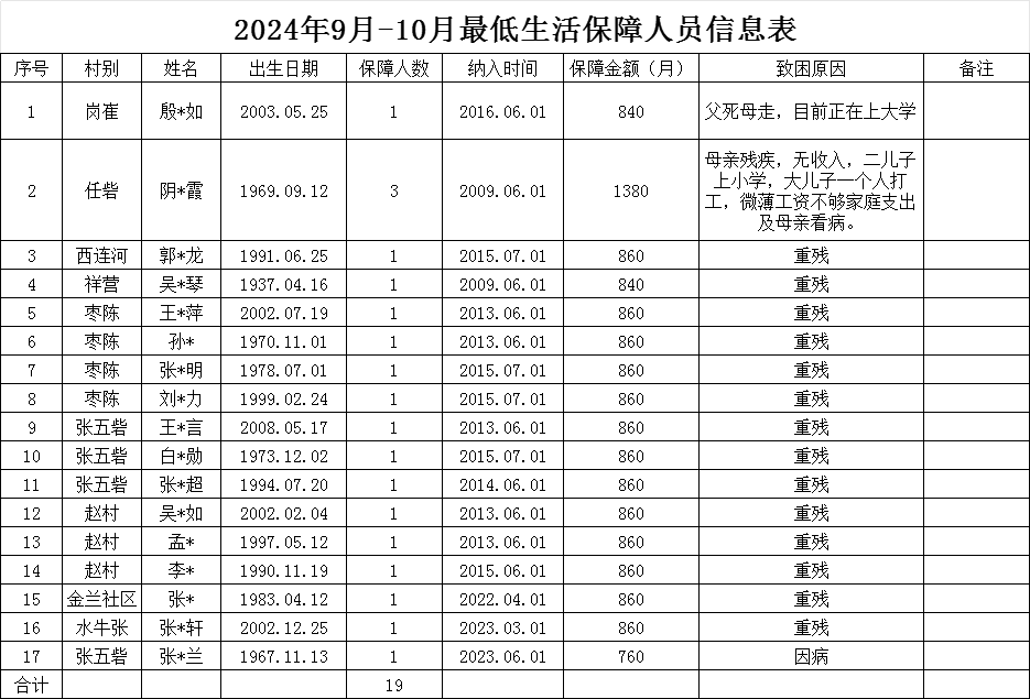 2024年9月--10月最低生活保障人员信息表