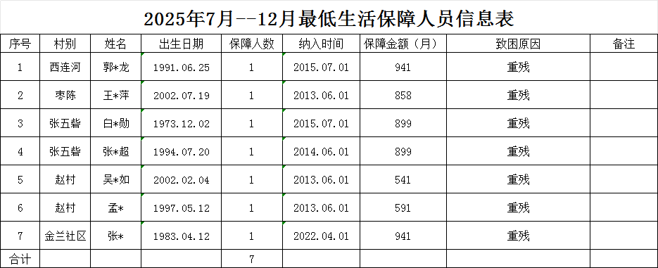 2025年7月-12月最低生活保障人员信息表