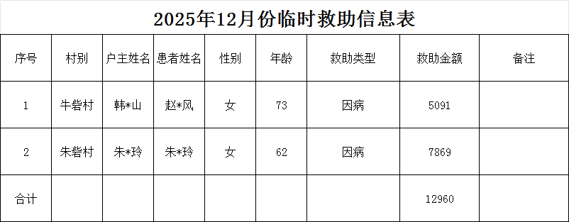 2025年12月份临时救助信息表