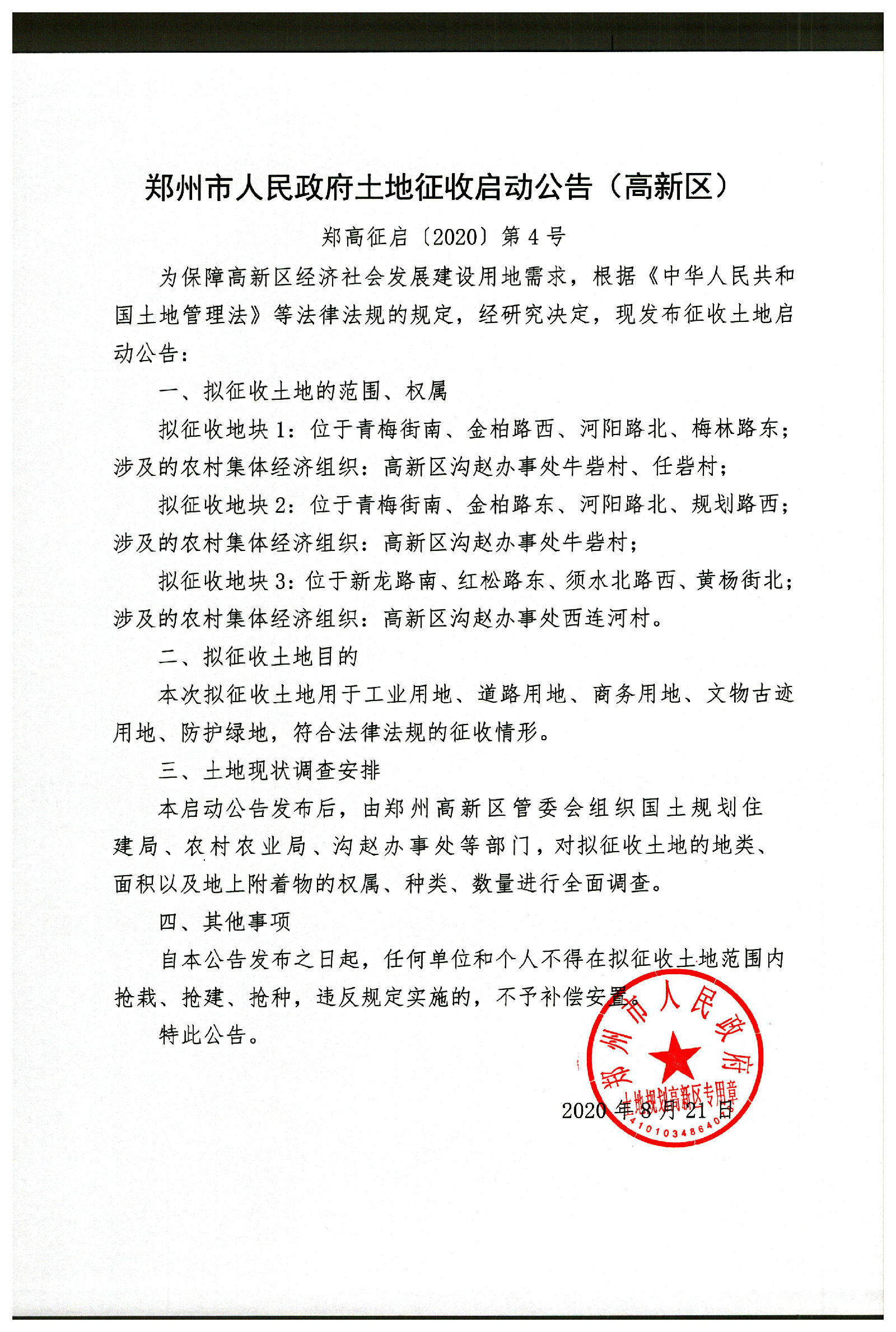 郑州市人民政府土地征收启动公告(高新区)