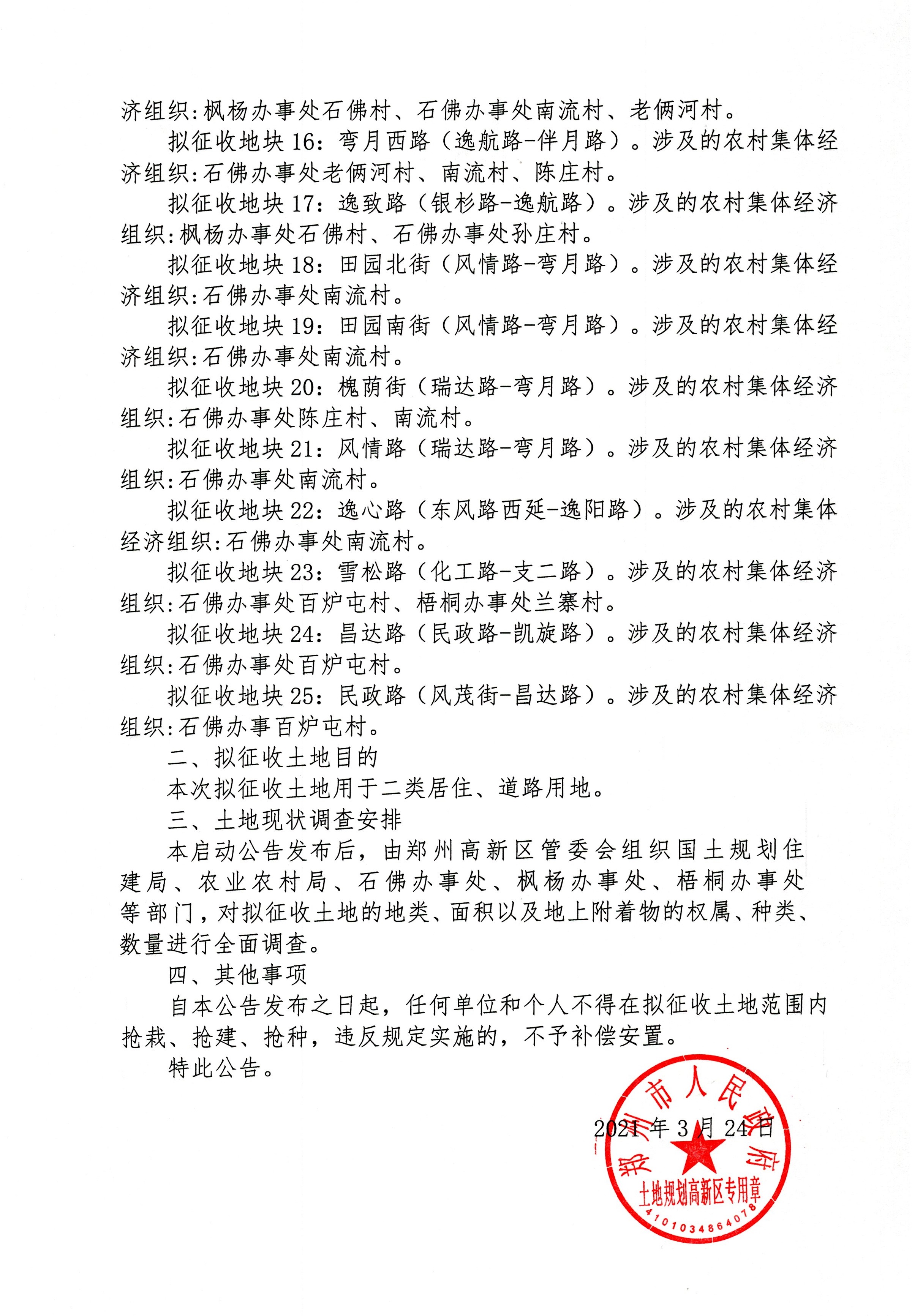 本启动公告发布后,由郑州高新区管委会组织国土规划住建局、农业农村局、石佛办事处、枫杨办事处、梧桐办事处等部门,对拟征收土地的地类、面积以及地上附着物的权属、种类、数量进行全面调查。
