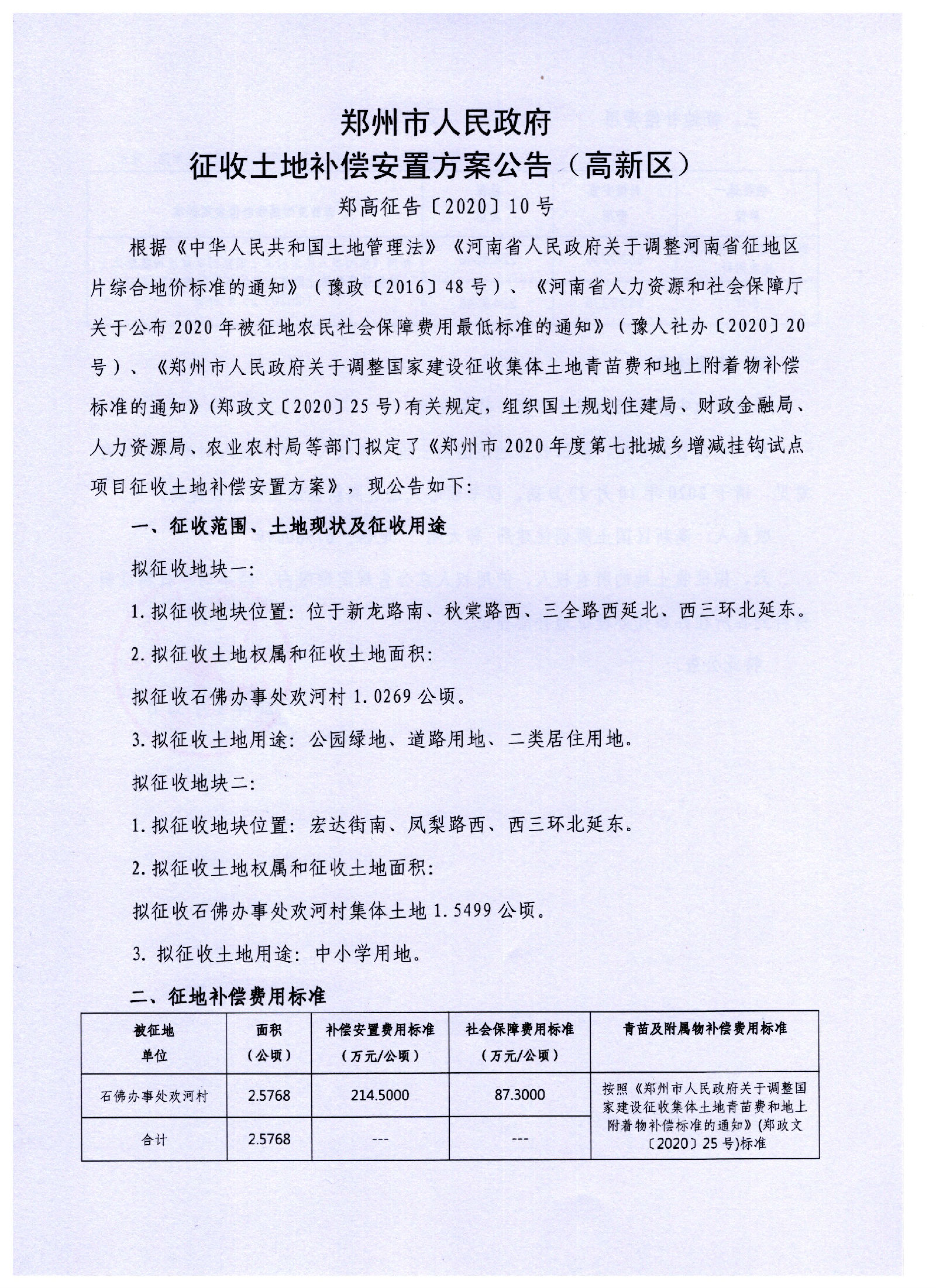 郑州市人民政府征收土地补偿安置方案公告(高新区)
