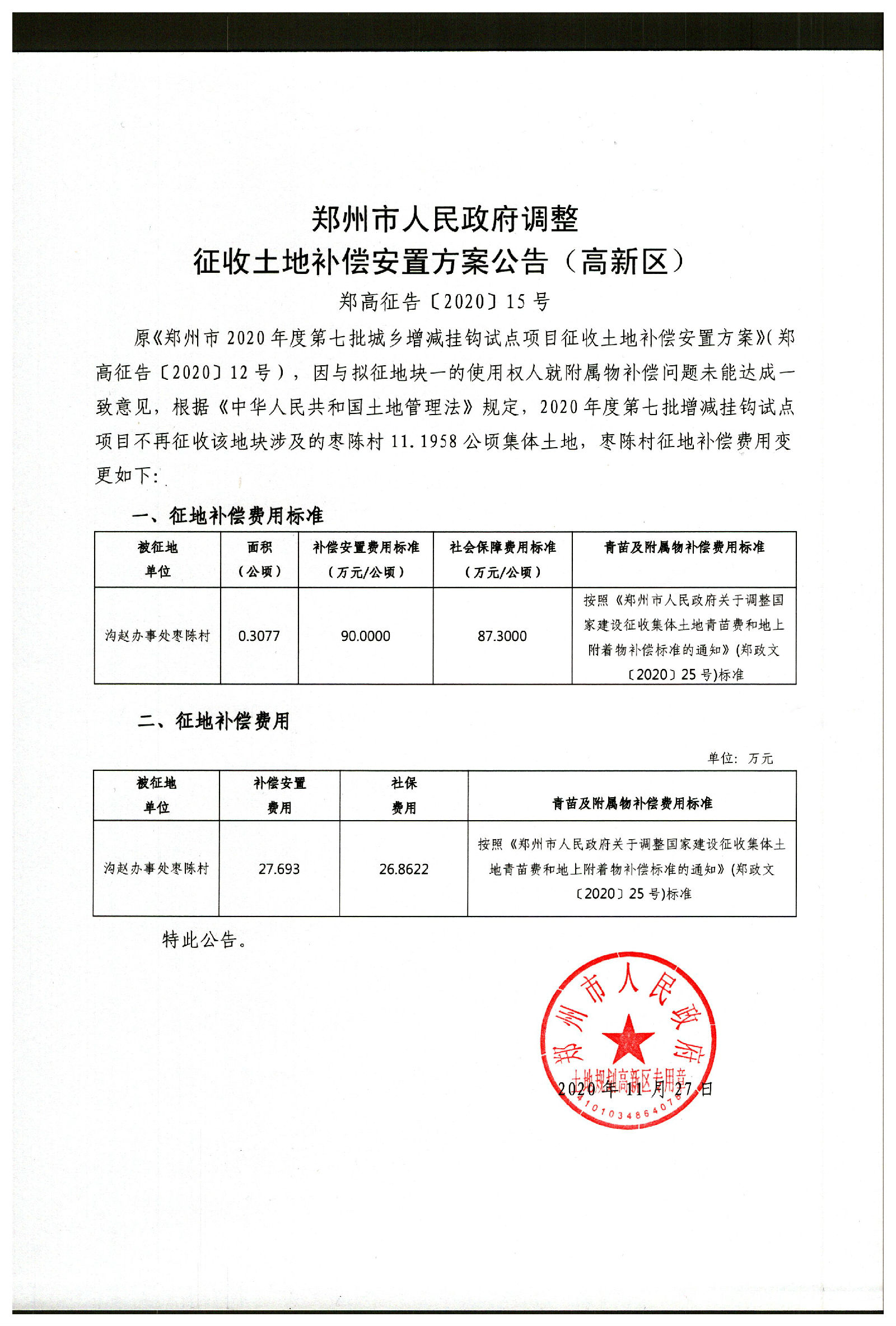 郑州市人民政府征收土地补偿安置方案公告(高新区)