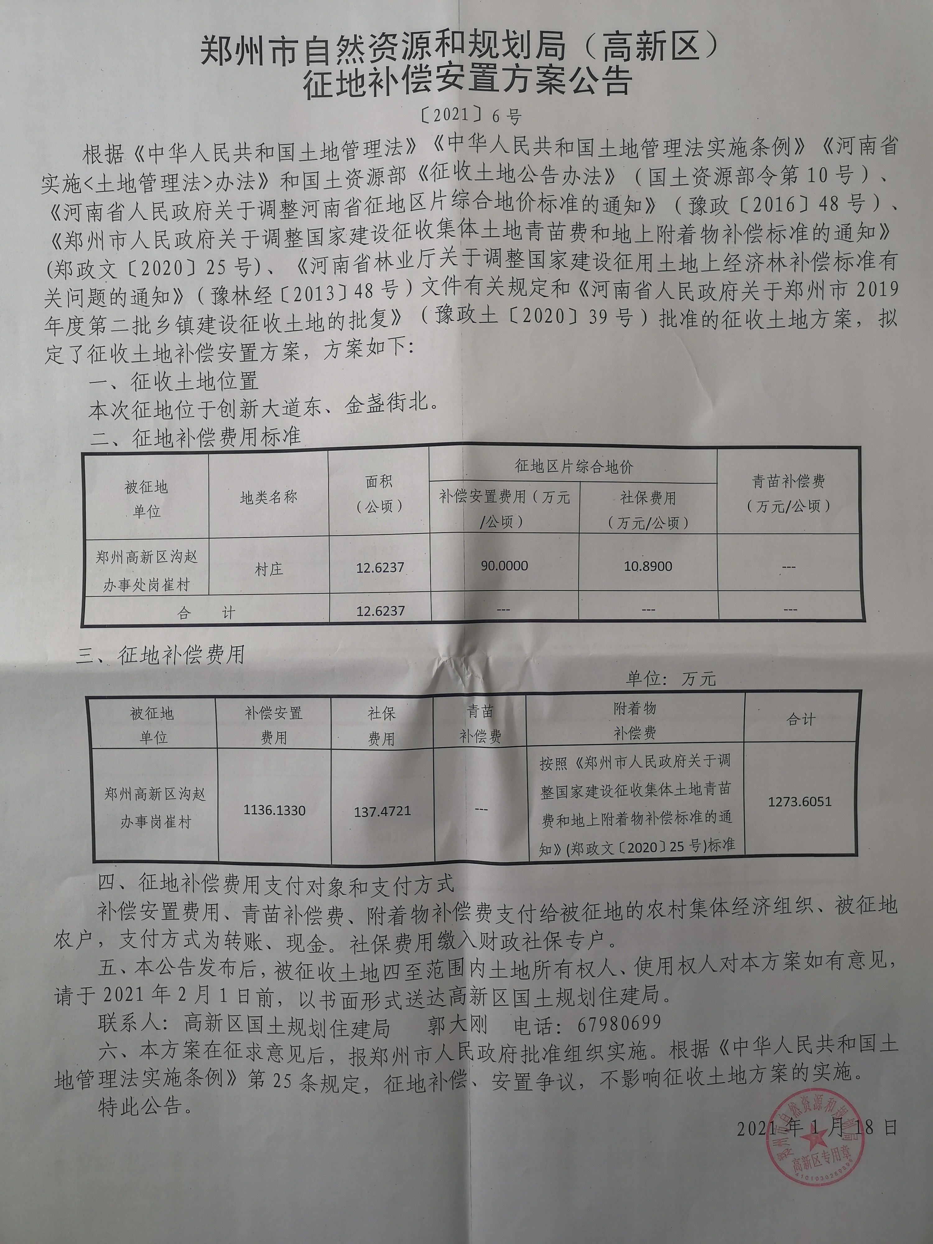 征地补偿安置方案公告【2021】6号涉及村组:岗崔