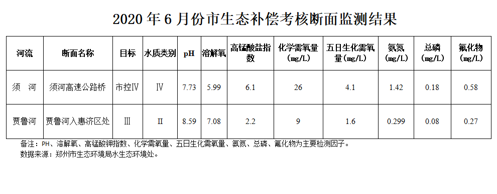 2020年6月份市生态补偿考核断面监测结果