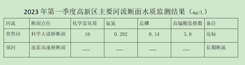 2023年第一季度高新区河流断面水质监测结果(mg/L)
