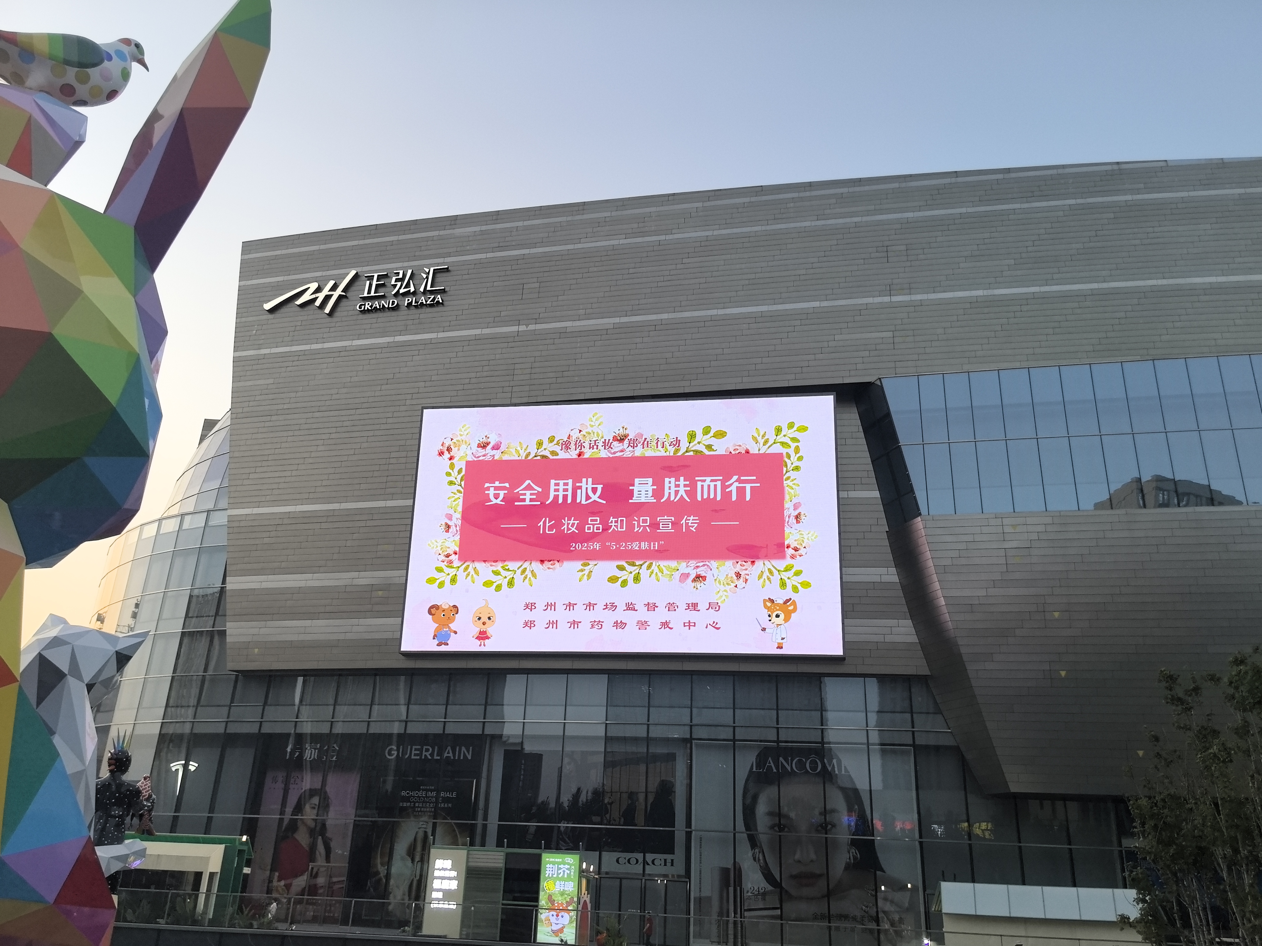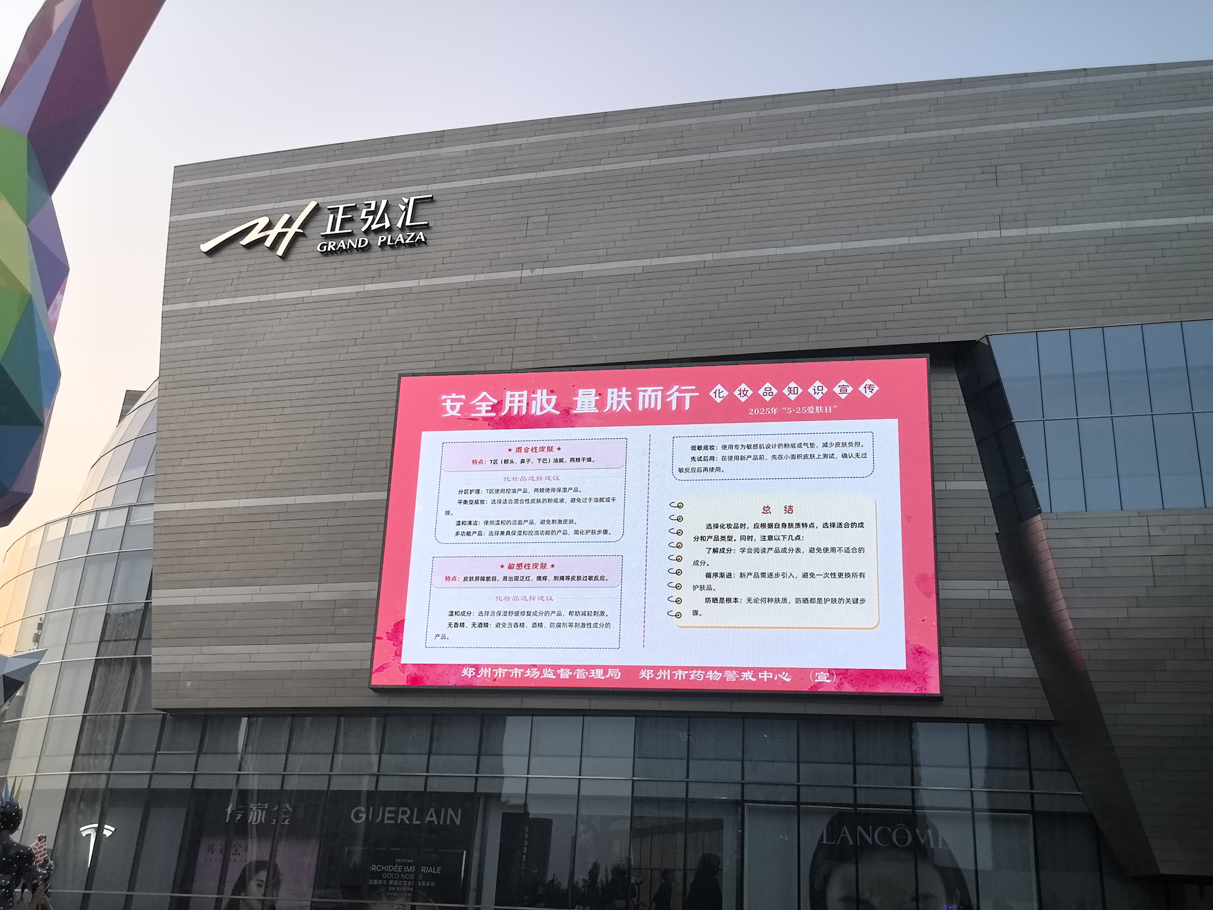 为加强化妆品不良反应监测宣传工作,普及化妆品相关知识,提高公众安全用妆意识,郑州高新区市场监管局5月25日在正弘汇、万达广场大屏幕播放“安全用妆,量肤而行”为主题“5.25爱肤日”宣传活动。